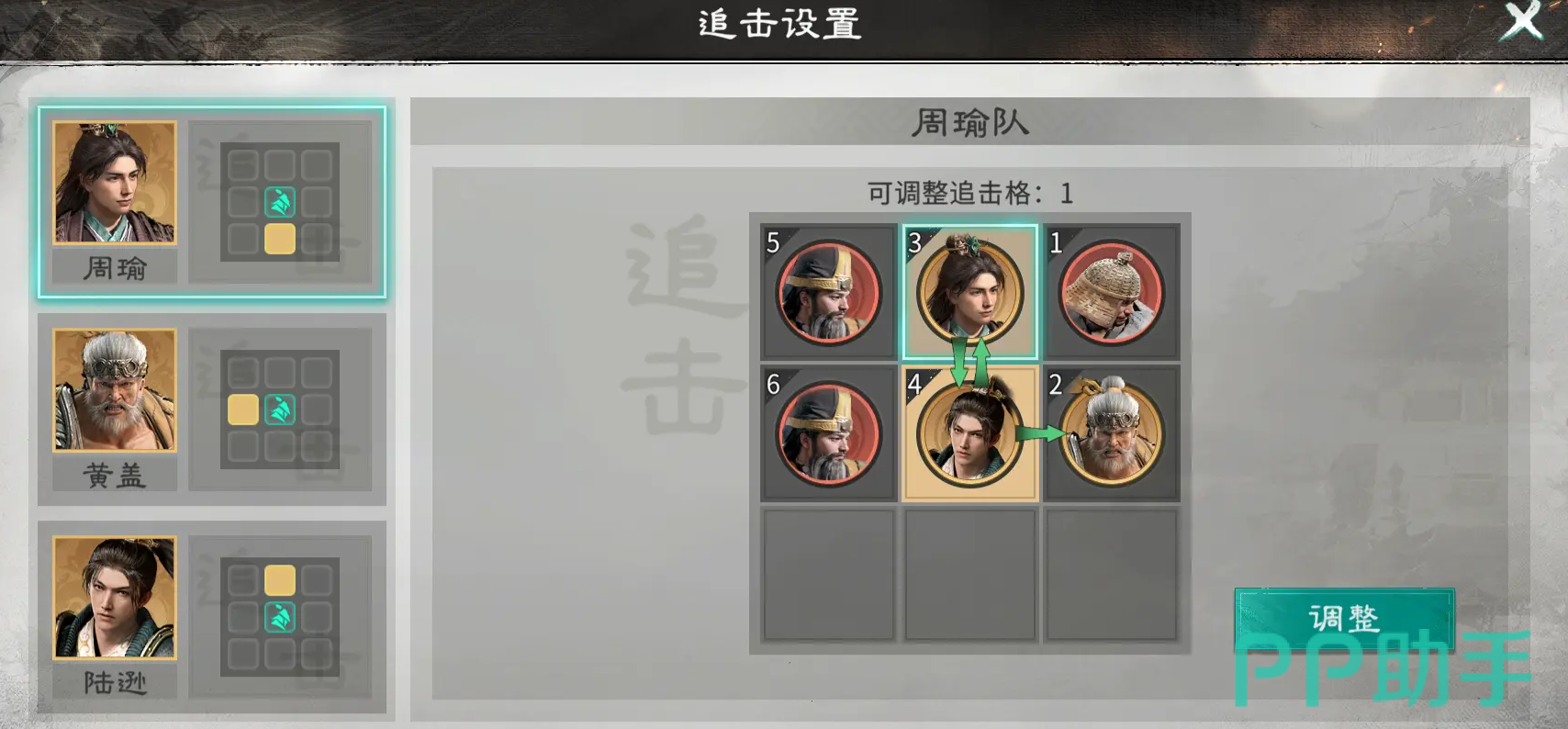 其中,“追击格”系统是影响战局走向的重要机制之一。绿色品质及以上级别的武将具备激活追击格的能力,在布阵时需确保目标武将准确踩入队友所生成的追击格范围内,方可触发额外行动机会。特别值得注意的是,刘备、曹操、孙权三位核心人物拥有双追击格特性,能够同时为两名友方单位提供追击支持,显著加快技能释放节奏,增强整体输出循环效率。