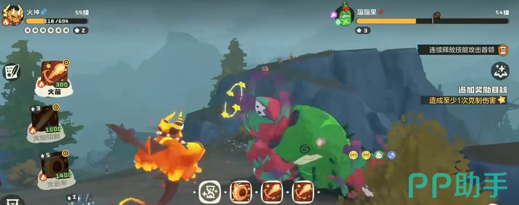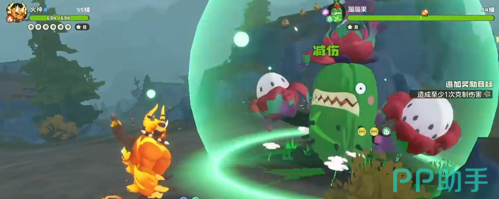 进入第二阶段初期,boss仍处于第一阶段遗留的眩晕状态,此时应立即使用“力量增效”技能叠加攻击力,为后续输出做准备。不久后,蹦蹦果将发动高威力草系七星级技能“光能聚焦”,该技能本身伤害极高,且首领在使用五星级以上技能时伤害翻倍,若未携带生命增益极易被一招击败。只要成功扛过此轮爆发,便可利用“火焰切割”、“火苗”等火系技能稳定压制,逐步将其击败。