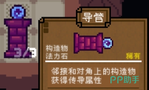 接下来是导管这一功能性构造物。该道具稀有度较高,需与法力石配合放置才能发挥最大效用。导管能够激活周围邻近以及对角位置的构造物,使其获得传导属性加成。然而需要注意的是,导管本身具有特定的空间要求,若放置位置过高,则可能无法正常触发联动效果,因此在布局时应优先考虑其所在行数,确保处于有效作用范围内。