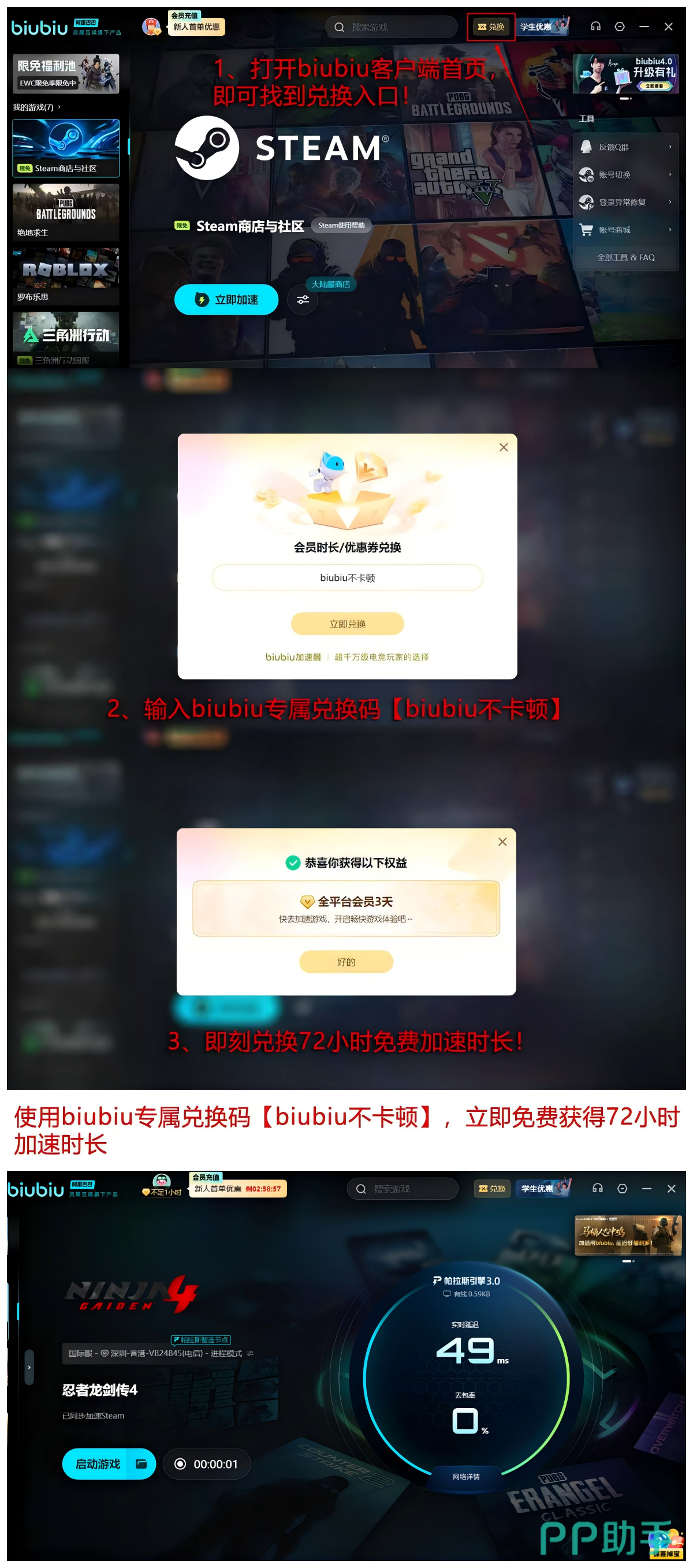 目前市面上众多加速工具中,biubiu加速器以其稳定性和高性价比脱颖而出。平台经常推出限时福利活动,尚未尝试的用户注意:输入口令【biubiu不卡顿】至右上角【兑换】栏,即可领取3天免费使用权;若为新注册账号,还可额外获得24小时畅玩资格,总计可达96小时免费体验时长,对于希望深度体验游戏内容的玩家来说极具吸引力。