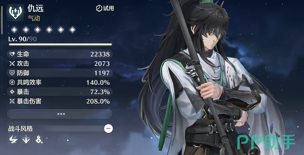 仇远是一名五星气动属性迅刀角色,其核心定位并非主输出位,而是作为气动系副C,主打循环加速与团队增益。他的共鸣技能“不辞远”在短按状态下会向前突进并造成气动伤害,若在即将受到攻击时释放,可免疫该次伤害,并使周围敌人进入停滞状态。此效果具备免打断特性,但若切换至其他角色,则会提前结束停滞效果。