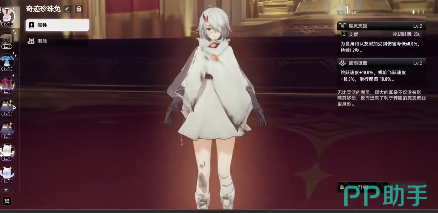 整体而言,珍珠兔魔灵是一个偏生存能力的魔灵,它并不具备有很强的攻击数值加成,实际在PVP战斗当中,它的出场率非常低,只有当玩家前期跑图时,它才能够发挥出效用。只建议前期玩家过渡使用,若后期有输出能力更强的魔灵单位,也可以直接替换掉珍珠兔魔灵,培养其他的魔灵单位。