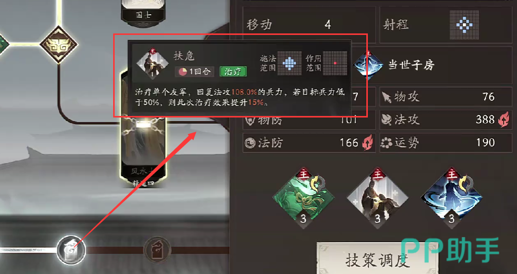 并且荀彧的技能效果还有一个“扶危”的能力,他可以治疗单体友军单位,恢复基于自身法术攻击108%的兵力,并且持续性的为单体目标赋予治疗效果提升15%的buff,在下一次恢复时,甚至可以直接拉满友军血量。