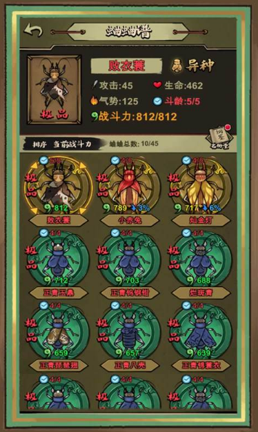 一个十分有趣的宠物战斗小游戏,玩家可以在不同场地进行蟋蟀的抓捕与培养,和朋友们进行策略与蟋蟀等级的战斗。每个蟋蟀角色会按照翅膀触须等数据分成不同品质,玩家按照技能特点进行战斗力的培养,饲料的品质也会影响战斗能力。游戏里可以进行蟋蟀一对一对决,也可以参与激烈的全国竞争,有希望得到终极目标--无双虫王。