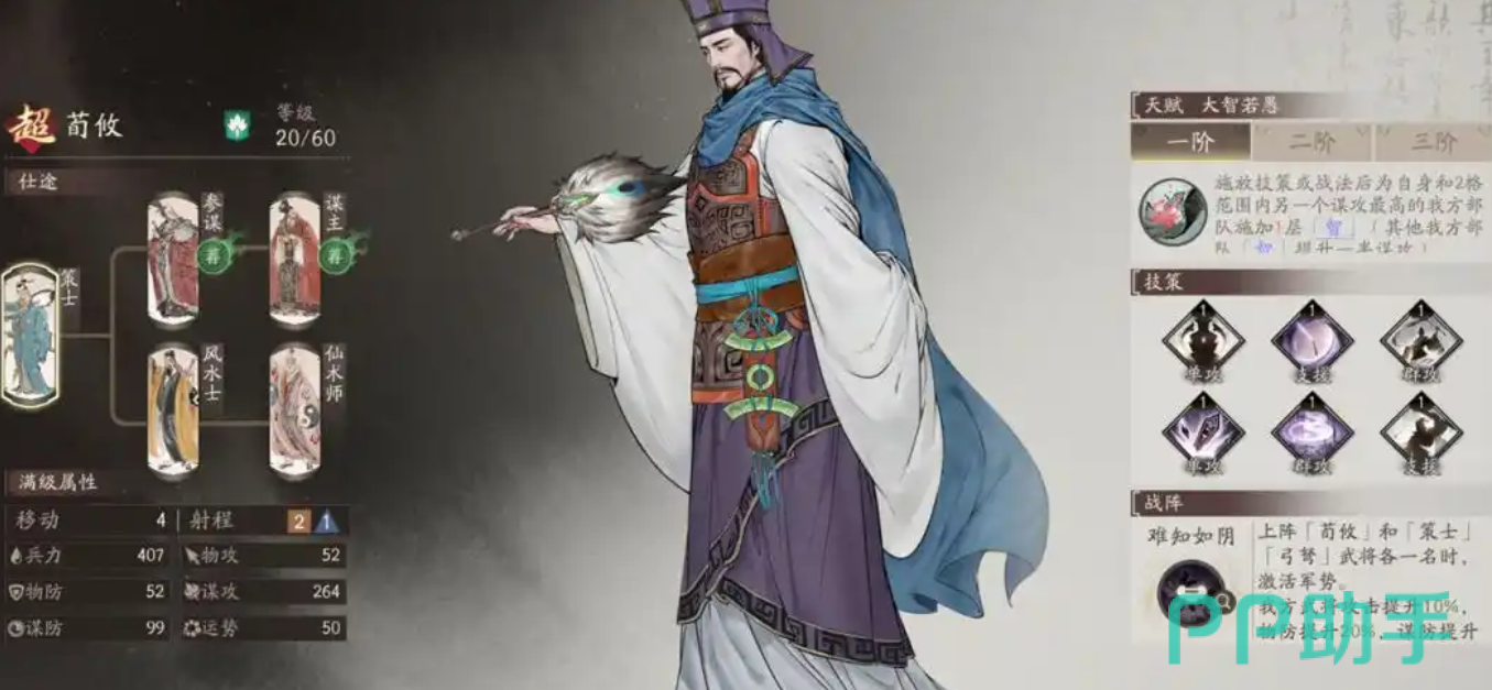 目前荀攸的强度主要在于能否在战斗中保持前排的生存,在前排能够吸引到敌人足够火力的情况下,荀攸的输出是无人能敌的,甚至能够达到T0强度,但是如果前排阵容过于脆弱,无法承担足够的伤害,那么荀攸的强度也会大打折扣,因此谋士阵的强度与队友的搭配息息相关。值得一提的是荀攸的搭配需要郭嘉、程昱等高输出谋士角色的搭配,但是这些角色的获取较为困难,因此目前荀攸的阵容搭配较为困难,但是随着未来角色的解锁,谋士阵的强度将会进一步的发挥。