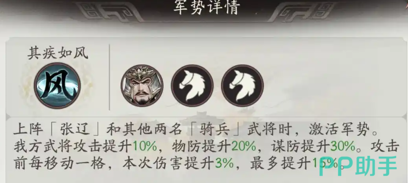 张辽属于骑兵阵营的代表人物,其军势技能得额外安排两位骑兵武将才可激活,最大的特点就是移动距离越远伤害越高,最多能移动5格距离实现满层增伤的效果。想要让张辽的军势发挥出最大的作用,骑兵角色的搭配就显得尤为重要。在实际游戏过程中,张辽这类能够与骑兵队伍进行搭配的人物就非常合适,特别是在游戏开始阶段,骑兵角色在游戏过程中获得的较多,例如关于、夏侯惇等,因此张辽的军势与队伍的契合度非常高。