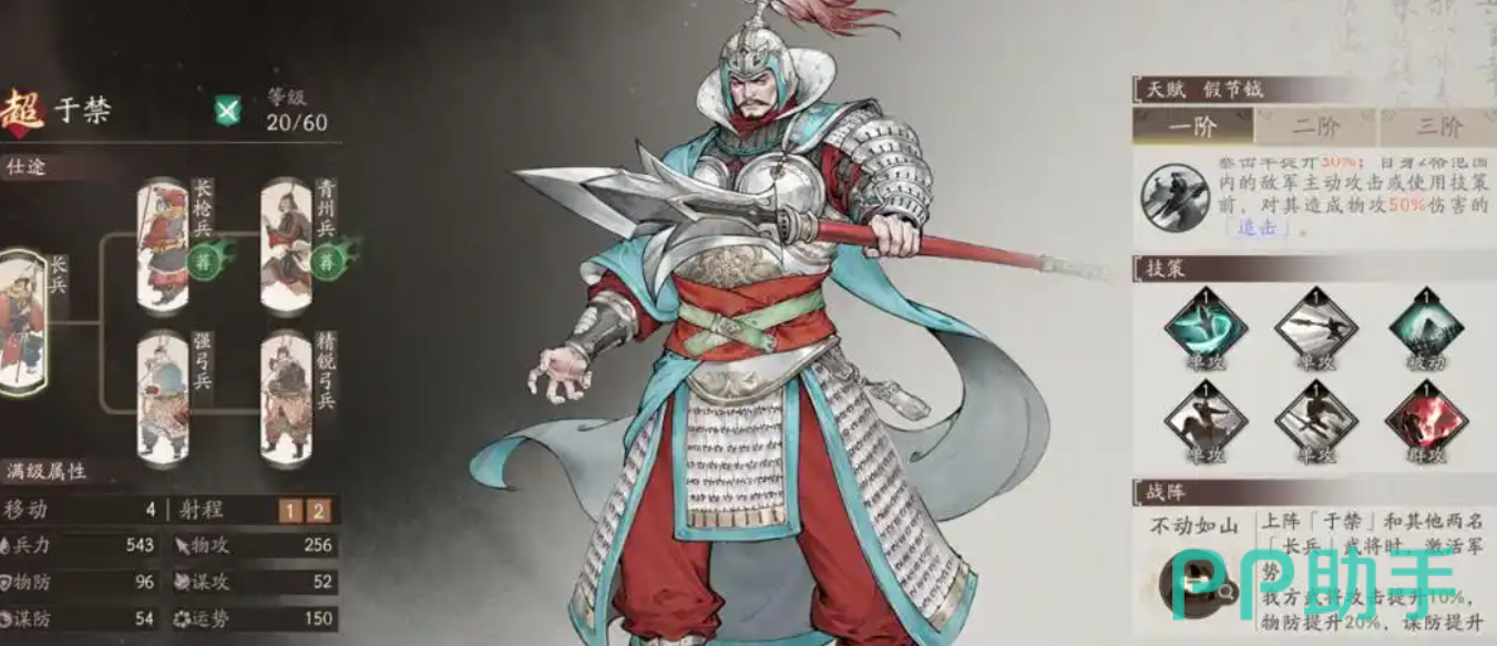 并且需要注意的是,于禁的军势需要另外两个长兵角色才能激活,这就需要玩家们抽取的时候考虑到自己的整体队伍的搭配,相比于张辽的泛用性以及直接输出的特性,于禁在PVE中可能会受到队友搭配的制约,但是在PVP战斗中,长兵队的反击以及追击往往能打乱敌人的节奏,尤其是在面对一些高输出敌人时,反击往往是最为关键的,所以如果你是PVP玩家,那么于禁绝对是值得你投资的一名武将,于禁的强度在T1,虽然在PVE中的表现一般,但是在PVP中还是有其一席之地的。