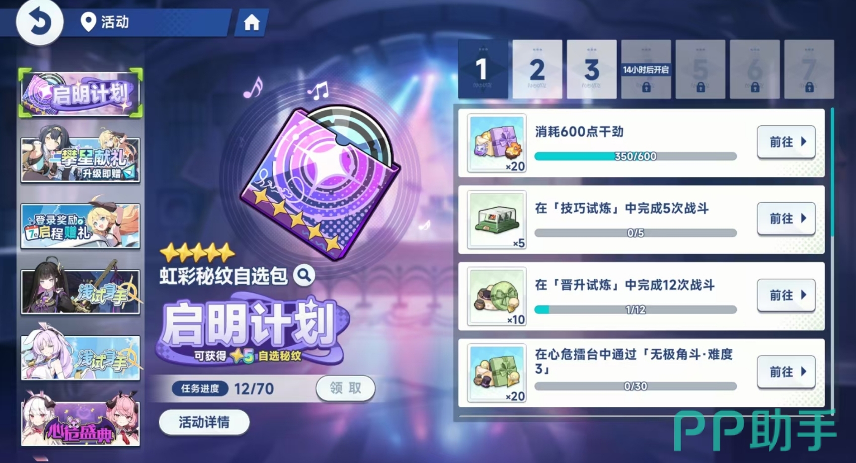 启明计划是每位玩家在入坑此作后就能参与的活动,它每天都会布置不同的任务让玩家们去完成,并会在第二天时解锁新的任务内容,全部完成最快也需花费七天的时间。若前一天的任务没有完成,各位也可接着继续做,不用担心它会过期,而且里边的一些资源消耗类的任务是叠加计算的,例如在完成消耗体力任务时,前一天玩家消耗了300体力,若任务更新后需要各位消耗600体力,那玩家只需再去消耗300体力,就能将该任务做完。此外,启明计划没有时限要求,即便玩家一直不去做,它也会一直存在。