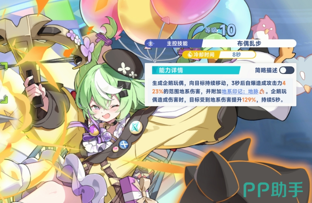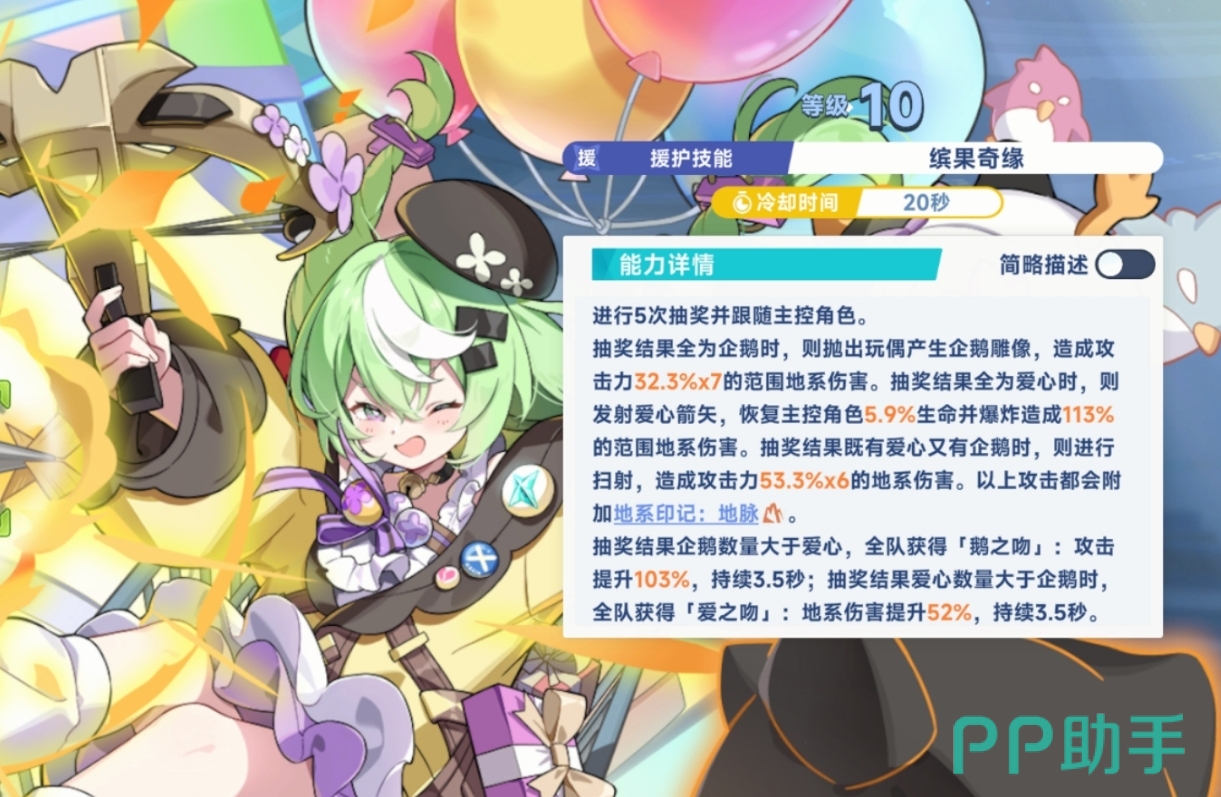 当小禾处于援助位时,能释放援助技缤果奇缘,会随机性地抛出企鹅或爱心,并会根据企鹅和爱心抛出来的数量,为队伍提供不同的加成。其中,若抛出来的都是企鹅,则会造成持续七次的地系范围伤害,全是爱心则会回复主控血量,同时还会造成一次爆炸范围伤。若企鹅和爱心都有,则会对敌人进行扫射。当抛出的企鹅数量大于爱心,小禾还能令全队享受到攻击力加成,反之则会提升全队的地系伤害,辅助能力极强。此外,不管缤果奇缘抛出什么样的结果,该技能都会对敌人施加地系印记,方便主控角色去进行引爆,这也令援助位才是小禾最为合适的位置。