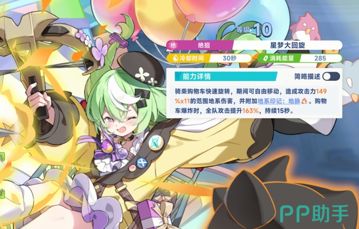 当小禾的绝招能量满了之后,便能释放绝招星梦大回旋。此时小禾会出现在场上并乘着购物车不断地在场上旋转,对任何技能范围内的敌人都施加地系印记,同时也会对它们造成一定的伤害。等绝招时限到了后,购物车还会在发生爆炸后为全队施加攻击力提升的效果,并且该效果会持续长达15秒的时间,因此也令该技能更适合在面对boss类敌人时释放,好令小禾的队友能吃满技能带来的加成。