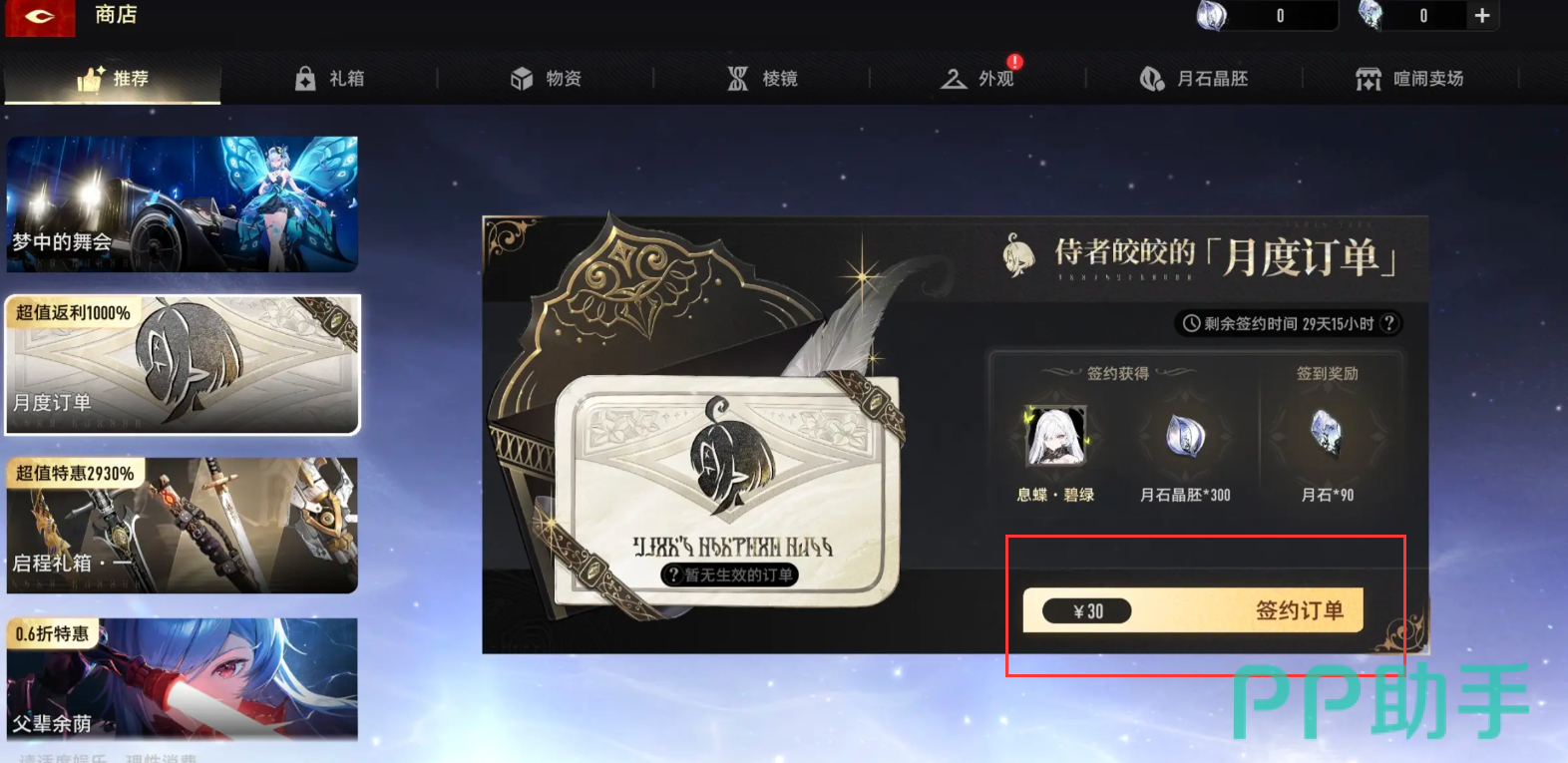 第二类是资源型付费选项,主要包括月卡、战令以及启辰礼包。购买月卡后,玩家可立即领取300月石晶胚和“息碟.碧绿”,此后每日登录还可额外获得90月石晶胚,在整个月卡有效期内总计可获取不少于3000个月石晶胚。