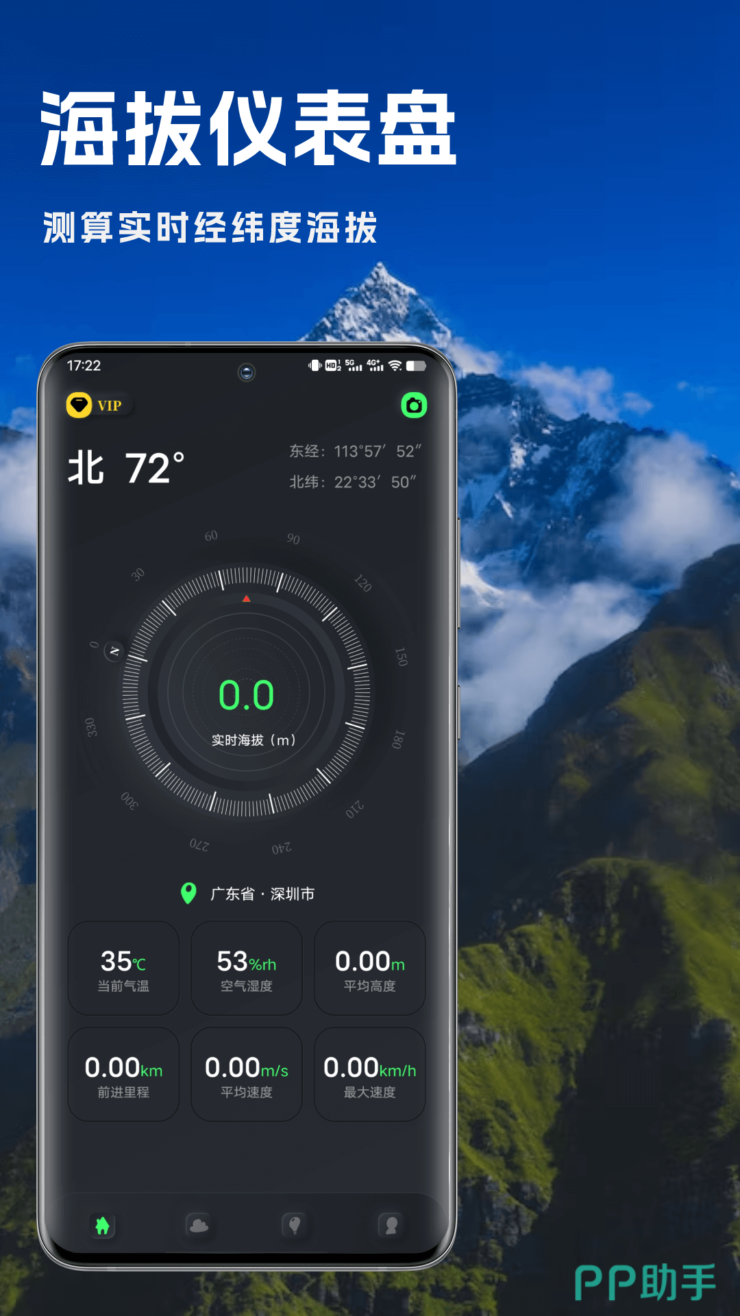 该软件适用于登山、徒步、科研考察等场景,此外,还集成了指南针、天气预报和手电筒工具,进一步满足户外出行的多样化需求,以轻量化设计和高精度测量为核心,成为户外探险者的随身必备工具,还提供悬浮窗功能,让大家能在使用其他应用时同步查看海拔信息,避免频繁切换界面的问题。