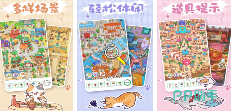 疯狂找东西以充满童趣的猫猫世界为背景,将场景寻物作为核心玩法,让玩家在轻松愉快的氛围中锻炼观察力,游戏里的场景丰富多样,从绿意盎然的公园到阳光明媚的海滩,每个场景都经过精心设计,隐藏着各种各样的物品,玩家需要在这些场景中仔细搜寻,找到指定的物品完成收集目标,才能解锁下一个关卡。