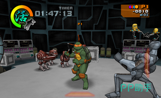 游戏就是专门为忍者神龟对打设计的。里面的对打规则很简单,就是控制忍者神龟把对手打败。你可以选择不同的对打场地,每个场地都有自己的特点。有的场地里有障碍物,你可以利用障碍物躲避攻击;有的场地里有道具,捡到道具能让自己变得更强。玩的时候不用想太多,只要尽情享受对打的过程就行。