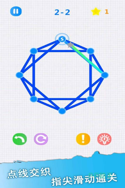 这款挑战大家空间能力的一笔连接游戏,通过有趣的复杂几何图形,让大家享受性条的魅力。各种有趣的连接关卡里,每个图案都设置了不相同的点位和线段,玩家需要在毫不重复的状态下,把所有线段与点位走一遍。游戏初始比较简单,但随着关卡提升,将会对玩家的规划与想象能力展示巨大挑战性,可以不断的尝试破解难关。