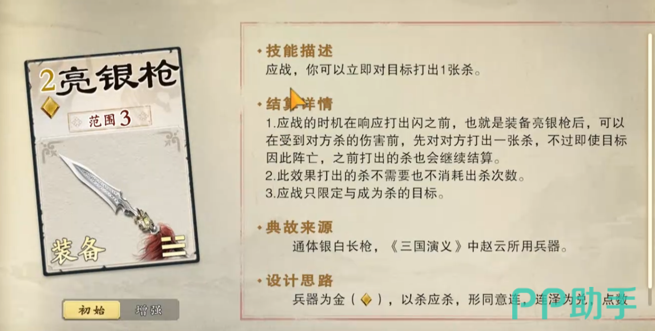 当成为【杀】的目标时,若已装备此武器,可在受到伤害前立即对该使用者回敬一张【杀】,实现反击先机。