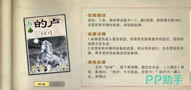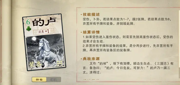 当装备者受伤时触发卜卦机制:若结果为1至7,摸两张牌;若为8,则弃置全部手牌与装备,且的卢被销毁。若因受伤进入重伤状态,需脱离重伤后才可触发效果。
