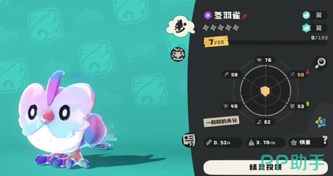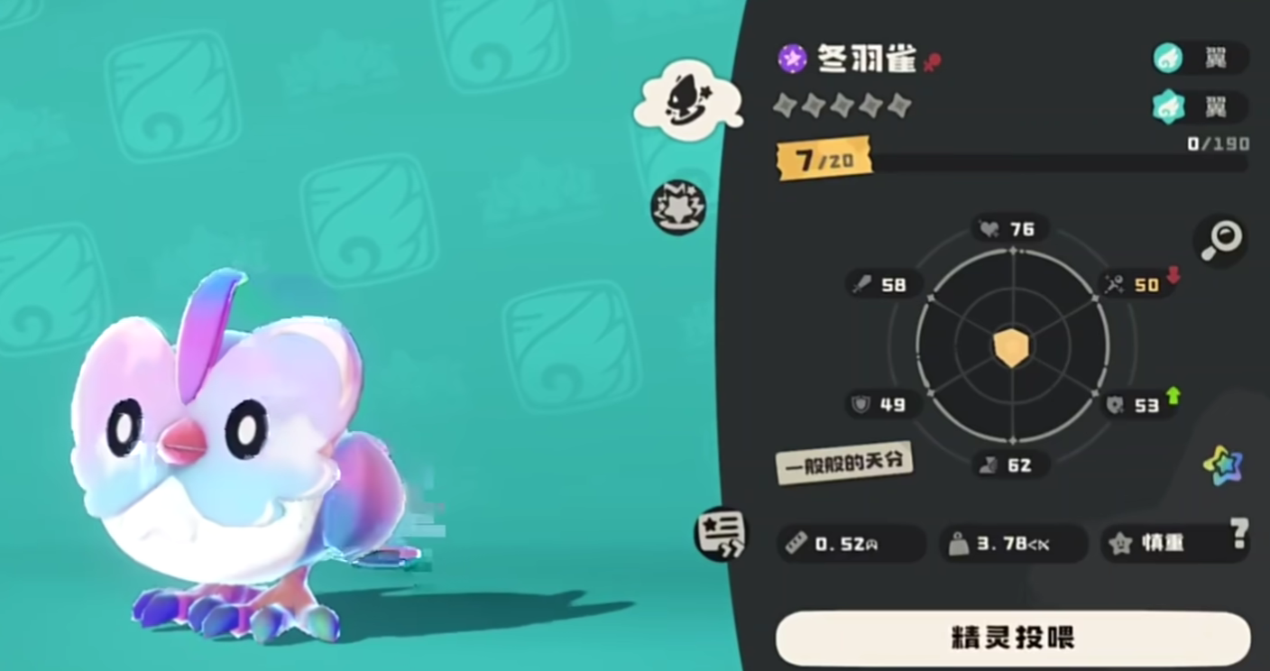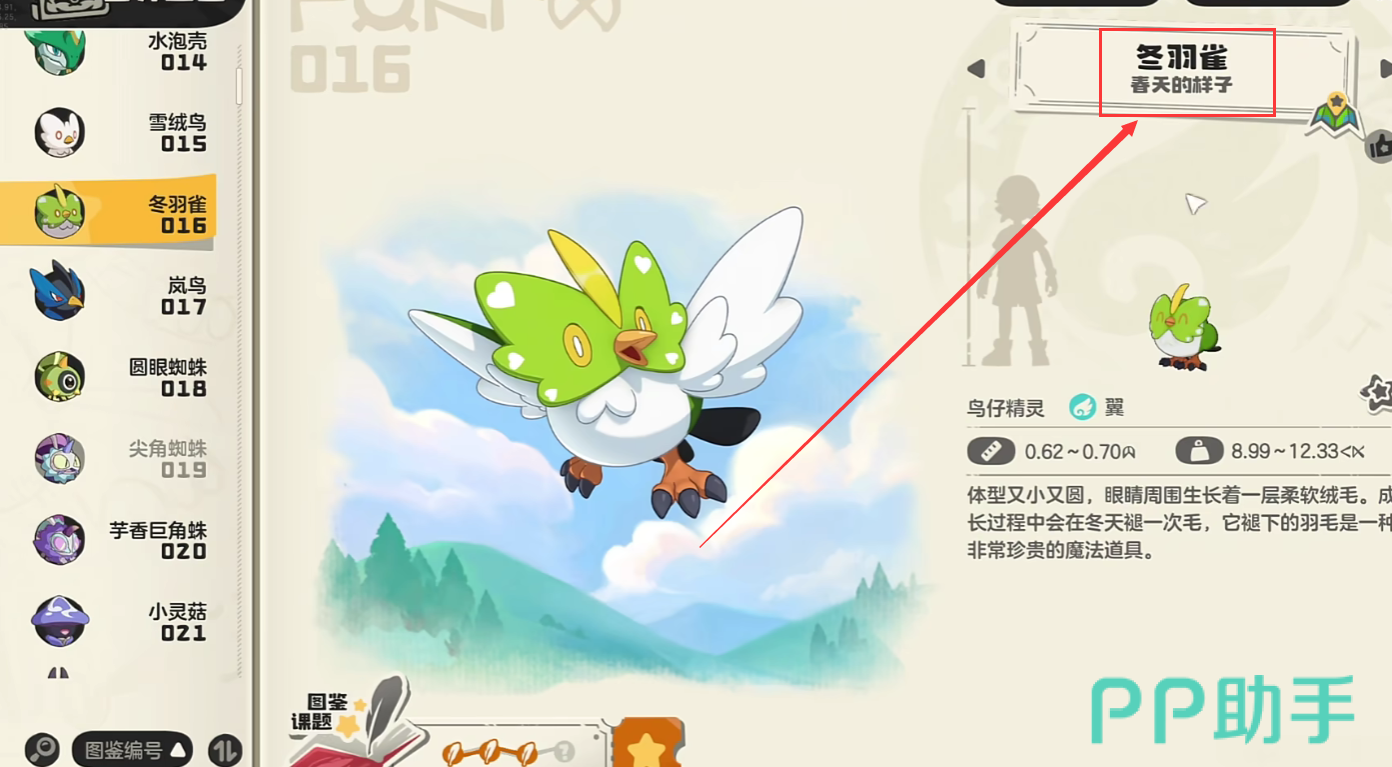 关于进化机制,冬羽雀在达到16级时会首次进化为翠顶雀;当翠顶雀等级提升至36级后,将进行第二次进化,转变为圣羽翼王;而当圣羽翼王成长至56级时,可触发最终阶段的超进化形态。完成此阶段进化后,该精灵不仅获得显著的速度加成,还将解锁“羽刃”专属技能效果,大幅提升输出能力。