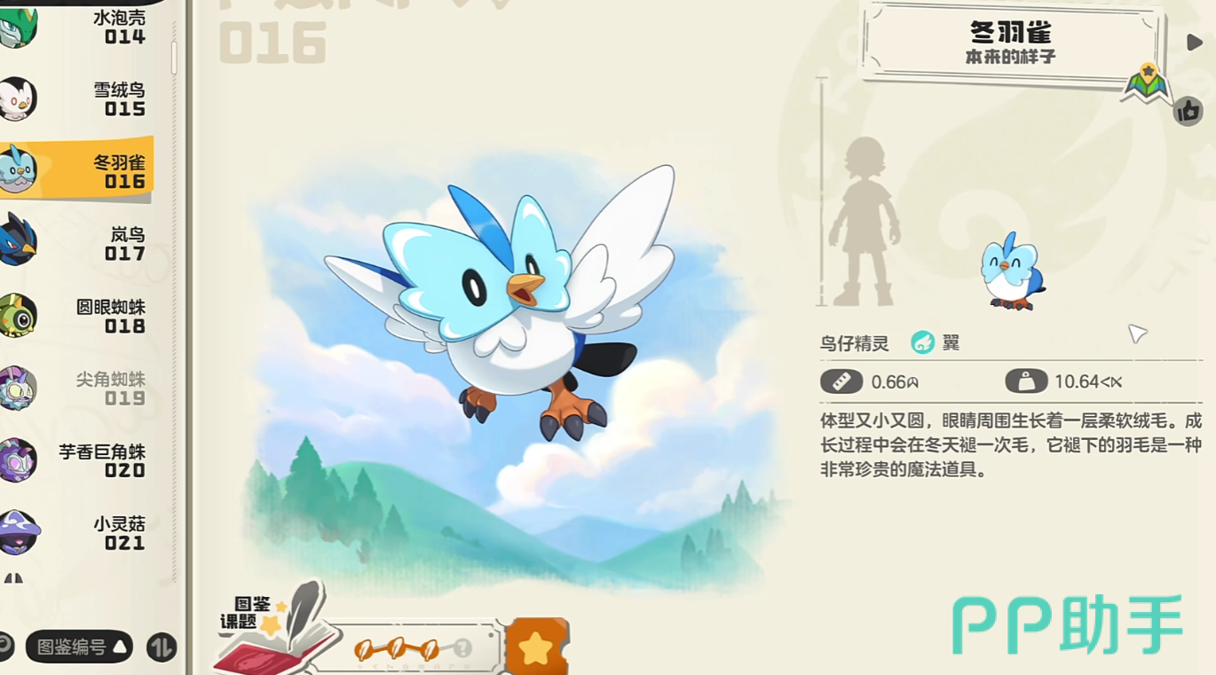 冬羽雀是一种典型的翼属性小精灵,外形类似小型鸟类,整体体型圆润小巧,双眼周围覆盖着细腻的绒毛。它每年冬季都会经历一次换羽过程,初始身高为0.66米,体重为10.64千克。该精灵在未进化前存在四种外观形态:春天、夏天、秋天和冬天形态,虽然视觉表现各异,但基础属性完全一致。