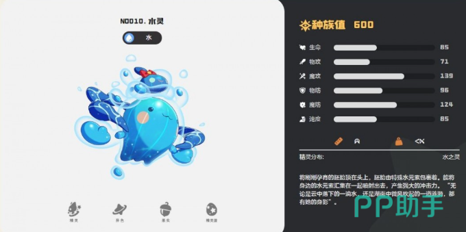 水灵:这是一只以魔法攻击为主的精灵,优势在于技能消耗低且具备持续输出能力。其魔攻种族值达到139,搭配保守性格能进一步放大输出潜力。在挑战后期高难度副本时表现尤为突出,面对血量较厚的精英敌人,可利用“浸润”技能叠加减益效果,逐步削弱对手防御,实现高效击杀。