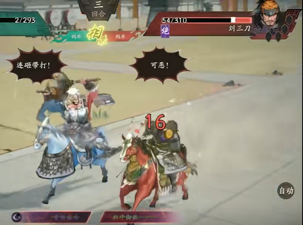 刘三刀的特点是爆发力高、动作快、单点攻击力极强,正面硬拼很容易吃亏。他打斗的时候经常会用上多段连斩和加强技能,如果被连击到核心角色,就很容易崩盘。因此,从对抗策略上来讲,玩家应当利用车轮战机制轮换的优势,在伤痛分担上各个搭档承担起部分毒瘤伤害,使得人数及其能力分成才能维持全队的组织稳定发展。此时防御型武将的选择就显得尤为重要,典韦、许褚这类能抗住刘三刀前两波爆发的武将就显得尤为重要。而辅助位的华佗、蔡文姬就要保证持续的恢复与增益,保证队伍多轮输出不掉线。