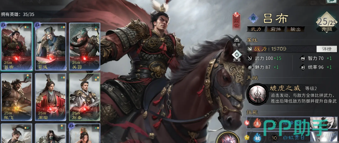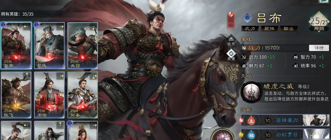吕布作为阵容中的输出核心,有着至关重要的作用,他的天赋能够吸取敌人的武力,吸取越多自己的攻击力就越强,让吕布在战斗中越来越强大,随着战斗的进行吕布的输出也会变得十分恐怖。而且他的追击技能让他每次攻击后都能再次发起攻击,高频次的攻击加上强大的输出让敌人防不胜防。所以吕布不仅是队伍的主力输出,还能不断积累战斗优势压制敌人。