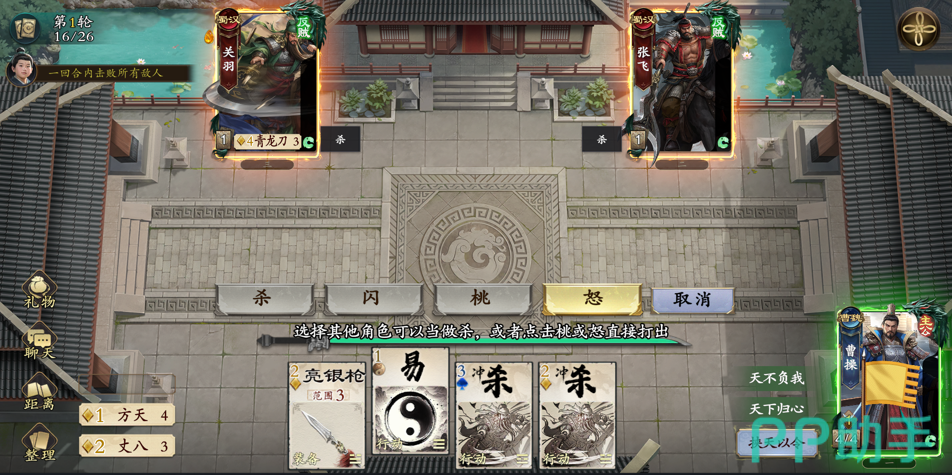 第43关的主要战术是以攻为守,用借刀杀人的方法来反制敌人。先对黄忠实施“借刀杀人”,指定张辽为对象。当火杀反弹到我方时,用“易”牌和“桃”自救,保持血量稳定。等到黄忠快死的时候,再把“易”牌变成“杀”对张辽出击,收割。第44关、第45关更加注重节奏控制,第44关用“烽火狼烟”、“阵前对决”连打可以很快获胜;第45关以“斩蛇起义”为主,打掉一个易牌后直接发“杀”,就能把项羽击败。