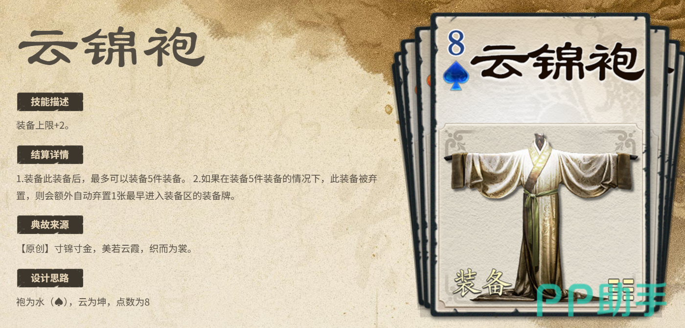 【云锦袍】属于典型的土属性防御装备,它的效果很特别,装备上限+2,也就是说玩家最多可以同时装备五件装备,而在普通情况下只能装备三件。此能力大大增加了角色的战术空间,使得玩家能够同时携带武器、防具、坐骑等多种装备,从而达到全面防御或者混合型配置的效果。结算的时候,装备满五件的时候弃置【云锦袍】的话,系统就会额外弃置最早进入装备区的一张装备,体现土属性“厚积而后损”的特点。