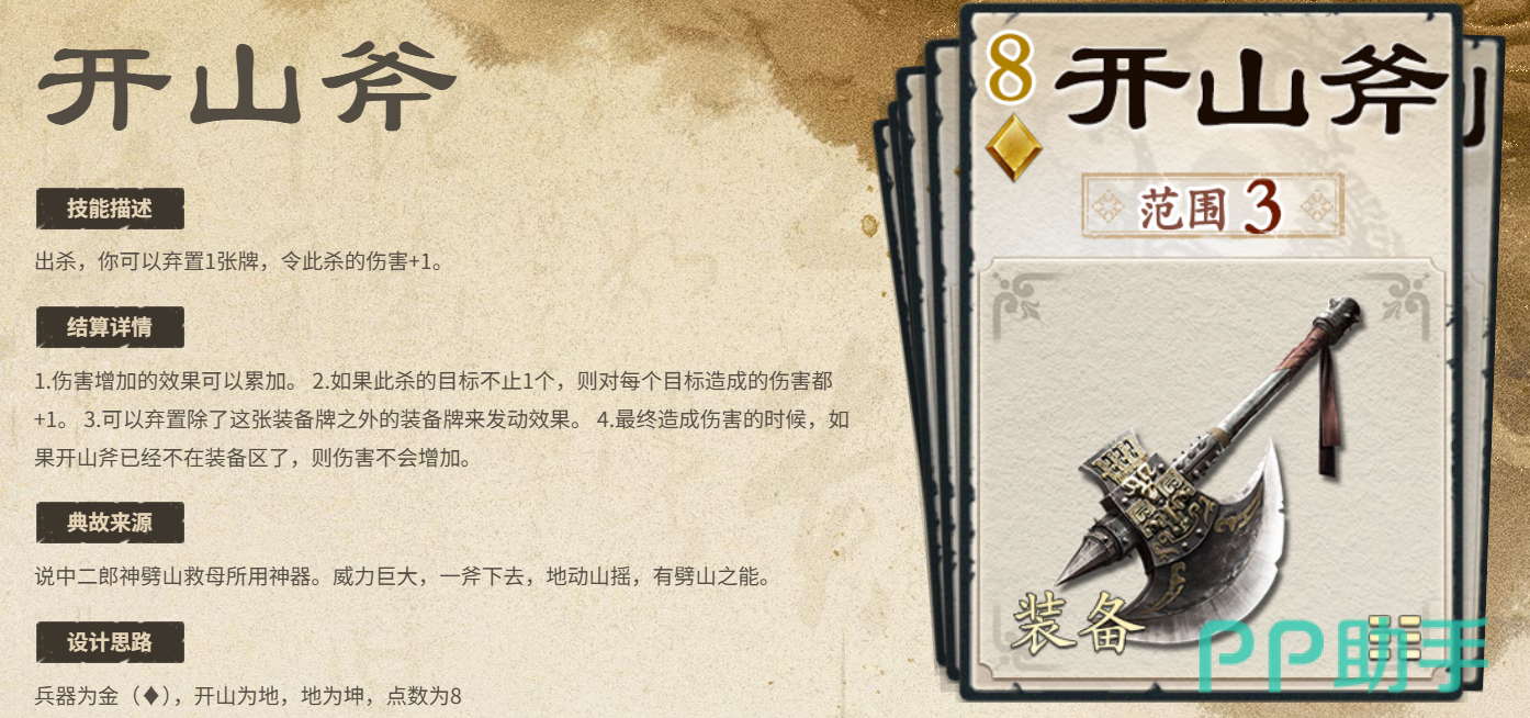 和云锦袍的防御强化不同,开山斧属于土属性装备中攻击力很强的一种。它的技能描述是:出杀,你可以弃置一张牌,使此杀的伤害加一。此效果使玩家在使用【杀】的时候可以主动消耗资源来换取更大的爆发力。伤害加成可以叠加,如果玩家连续使用弃牌动作,就能打出巨大的伤害。结算部分说明,如果【杀】的目标超过一个,那么每个目标的伤害都会增加一,所以在群战中特别有效。