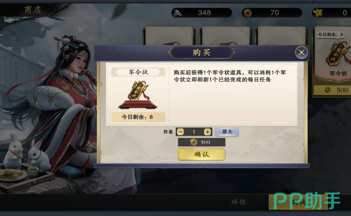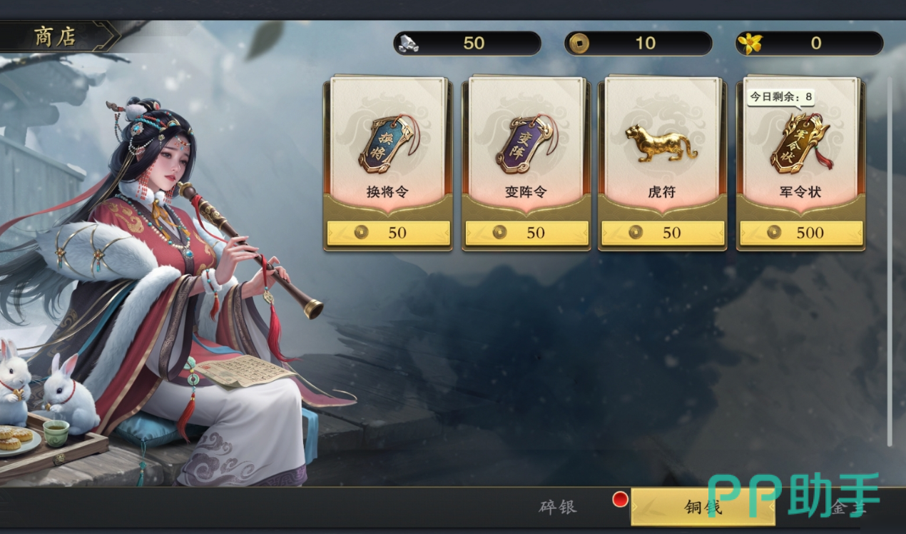 铜钱的使用主要集中在游戏内的铜钱商店,玩家可以用它换取各种实用的道具。商店里主要有四类商品,分别是军令状、变阵令、换将令和虎符。军令状是每天限购的道具,适合急需碎银来招募武将的玩家使用。购买军令状并完成速刷后,玩家可以迅速获得大量的碎银,用以支持武将的升级以及技能的强化。这也使铜钱的日常使用和对局参与密不可分,形成了游戏经济系统的主体循环。