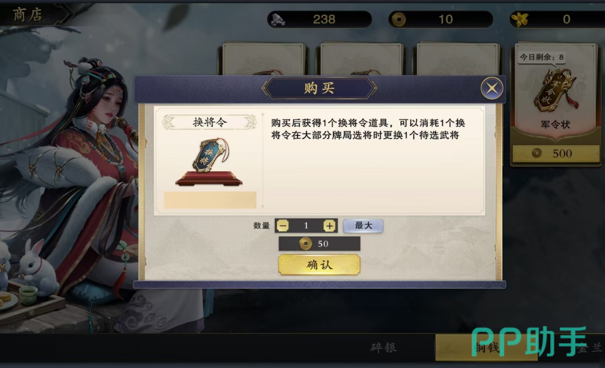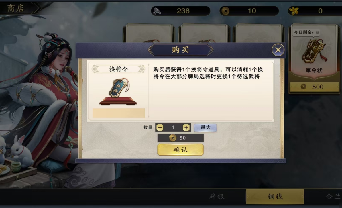 除了军令状之外,变阵令、换将令也是铜钱兑换的重点道具。变阵令可以使得玩家在对局中改变手牌组合,更加灵活地应对战场局势;换将令可以使得玩家更换角色武将,给战术调整带来方便。这两类道具在日常对局中使用价值很高,在遇到复杂的局面或者排位赛的时候,可以很大程度上影响到比赛的结果。虽然此类道具没有每日数量限制,但是有使用次数的限制,所以玩家要根据自己的需要来合理分配,不要造成铜钱的浪费。