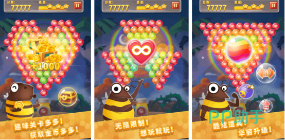 可爱又清新的泡泡龙,建议尝试,探索之后肯定会深深的爱上,有独特的创意玩法,全新的关卡和心灵的无尽体验,小伙伴们可以跟随小蜜蜂波比,在超大的丛林当中我你不说。能通过完成泡泡龙消除的方式来收集蜂蜜,有较为丰富的道具,在遇到困难时可使用这些道具助力你成功通关。