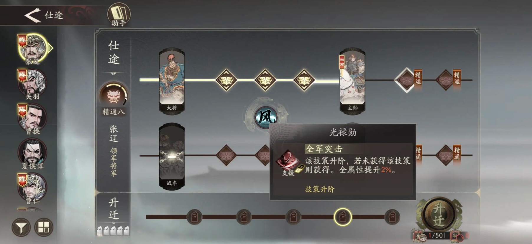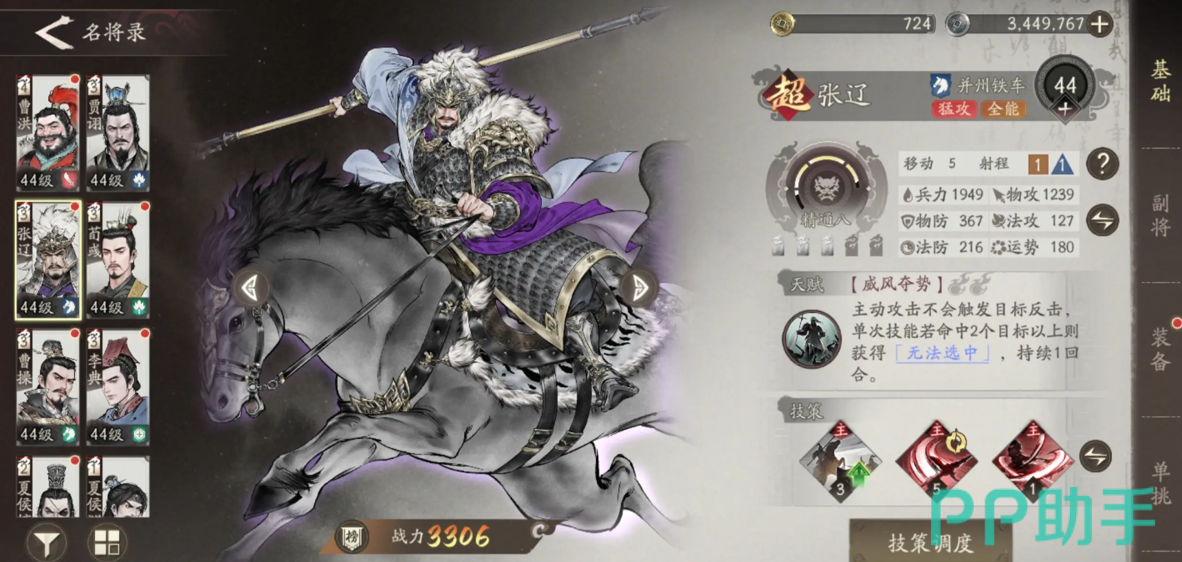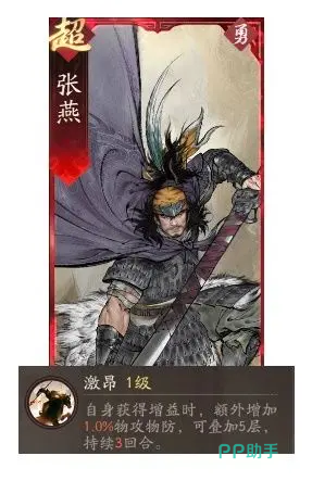 在前期阶段,张辽主要承担强力辅助角色,具备出色的战场穿越能力;进入后期后则转型为高爆发的群体输出核心。其核心技能“破军”不仅能提供可观的增伤效果,还可与其他增伤类技能叠加生效,配合全队移动+1的机动性加成,无论在何种养成阶段都应优先保留。二阶升级后,增益持续回合数增加至3回合,使状态更稳定;三阶进一步缩短技能冷却,显著提升循环效率。