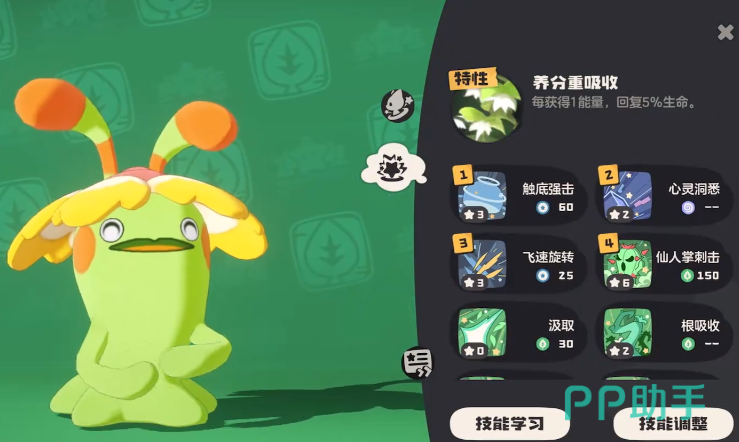 另一种常见路线是防御消耗型,该路线侧重于延长战斗时间,通过持续干扰对手来取得胜利。此类奇丽花建议选择“沉默”性格,该性格可提高生命值成长,同时降低物攻,虽牺牲部分攻击能力,但能显著增强生存能力。核心技能搭配为“寄生种子”与“毒雾”,前者用于吸取对手生命,后者则可造成持续中毒效果,两者结合形成双重消耗机制,尤其克制依赖站场输出的精灵。