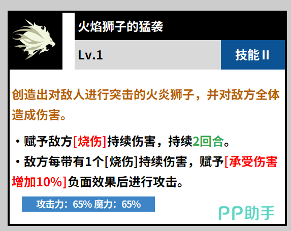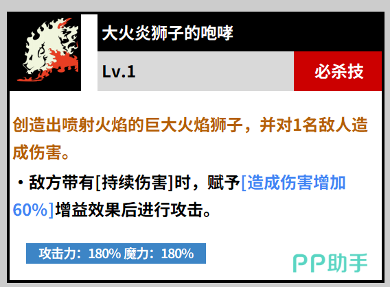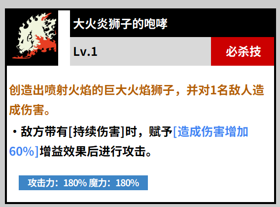 必杀技名为“大火焰狮子的咆哮”,可视作二技能的强化版本,具备更广的打击范围与更高的基础伤害。当敌方单位携带持续伤害类DEBUFF时,此技能可额外提升60%的伤害输出。配合团队中的烧伤叠加机制,能够在群体战斗中打出爆发性的总伤表现。
