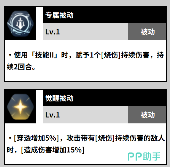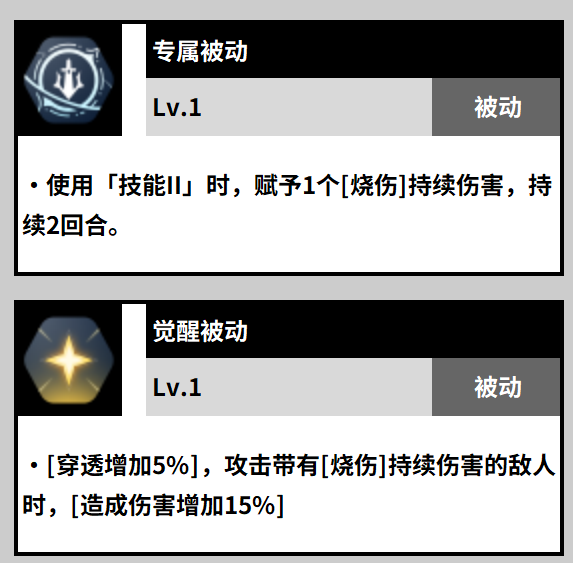 专属被动1:释放技能二时,可为目标附加烧伤状态,造成持续伤害并维持2回合。觉醒后被动提升穿透效果5%,当攻击带有烧伤状态的目标时,造成的伤害提高15%;觉醒升级后,穿透额外增加10%,对处于烧伤状态的敌人伤害提升至30%。