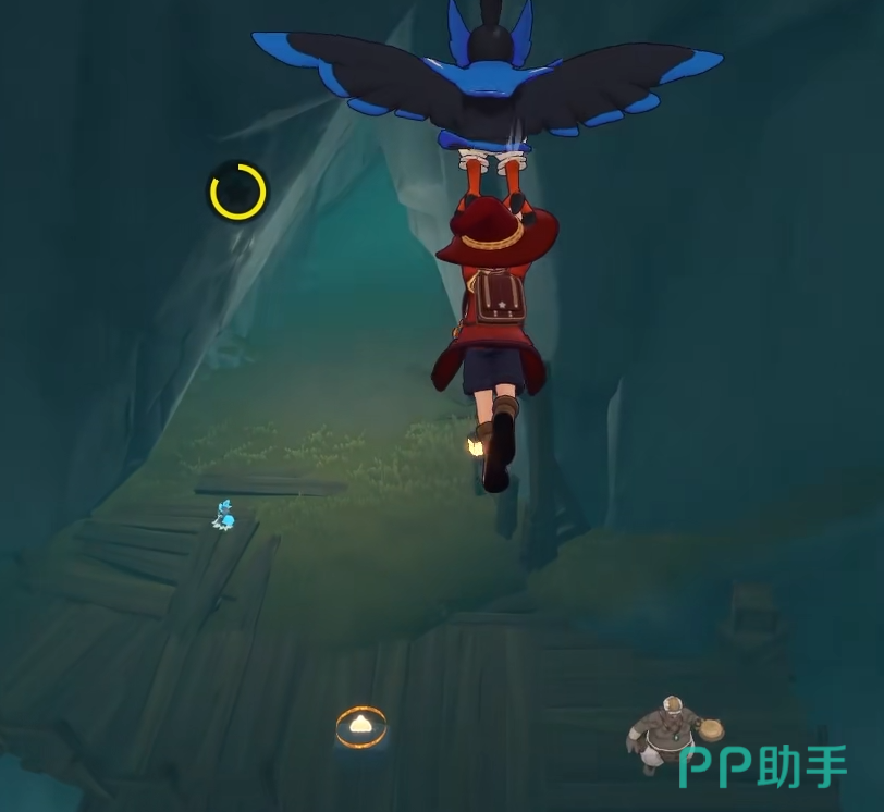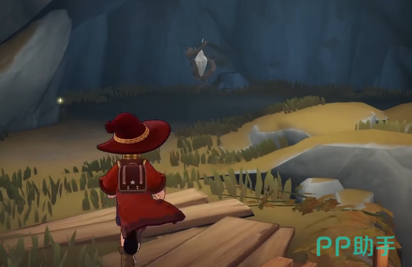 在视野左下角可以发现若干木板结构,并有一位NPC存在。召唤飞行坐骑,朝该方向飞行。落地后将看到一处洞口,进入洞穴内部,在左侧可见一段木质梯子。攀爬而上,沿通道直行即可抵达信仰者之村的核心区域——魔力之源所在位置。