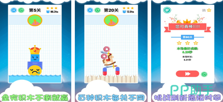 《积木派我对战:我是平衡大师》专注于物理堆叠与重心控制的挑战。游戏中设有多种动态平台,会因积木叠加而产生倾斜或晃动。玩家从上方传送带获取积木,需谨慎放置于平台上,时刻关注重心分布。一旦失衡,已堆叠的结构将倒塌,导致挑战失败,极具紧张感与操作反馈。