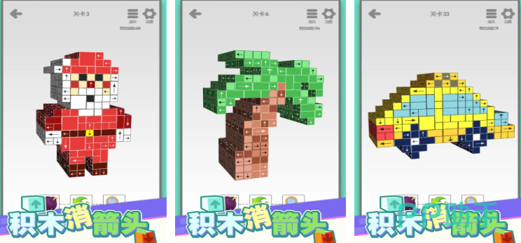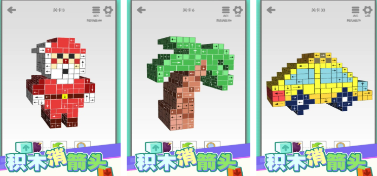 《积木消箭头》是一款以逻辑消除为核心的策略型积木游戏。画面中布满带有方向指示的积木,部分还标注数字,表示需多次触发才能清除。玩家通过点击或滑动调整箭头朝向,当相邻积木的箭头形成闭合回路或连续路径时,便会触发消除效果,并可能引发周围积木的连锁反应,带来爽快的连消体验,考验玩家的空间判断与规划能力。