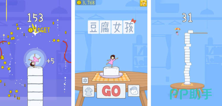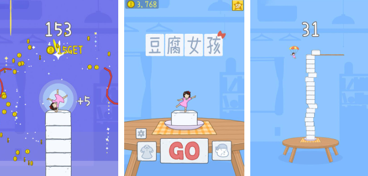 在《豆腐女孩-搭建你的豆腐小山》中,各类形状的豆腐块自屏幕顶端陆续下落,包含巨型豆腐与发光黄金豆腐等特殊类型。玩家通过点击控制落点,目标是将其堆叠成一座稳固的高塔。由于豆腐质地柔软,堆叠时会发生轻微形变,若上下层接触面积不足,极易发生滑落,因此对摆放精度要求较高,极具挑战性。
