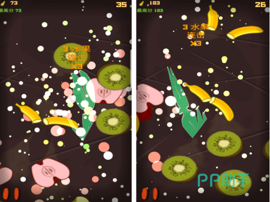 以大家在生活中常见的各种水果为主,不仅可以看到大西瓜,还有香蕉,猕猴桃等,主要的玩法就是,需要你在屏幕上出现各种水果的时候,利用滑动的方式将其切除,如果每次能获得连击的话,也可让玩家的分数更高。由于在玩的时候还会遇到炸弹,所以碰到炸弹的情况下,也会让玩家的分数受到影响,所以要仔细观察屏幕。