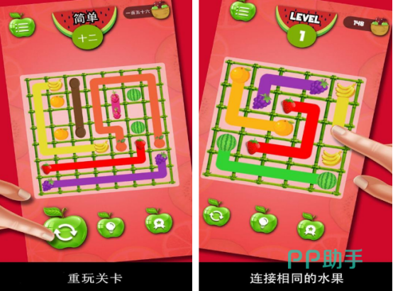 玩法比较简单的手游,通过利用线连接相同水果的方式,来完成匹配,只有将每个关卡当中所有的水果都进行配对的情况下,就能完成关卡的任务。主要的特点就是在每次连接的时候,线条是不能重叠在一起的,所以看上去玩法特别的简单,而在真正挑战的时候就会知道有一定的难度,一定要仔细的观察布局,才有机会得到相应的奖励。
