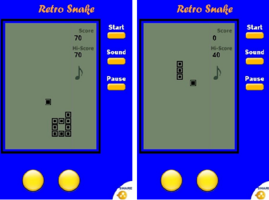 屏幕右侧将会看到开始以及各种菜单的选项,而下方又会有各种虚拟的按键,开局之后只有一个小小的方块。通过合理走位的方式,吃掉更多的方块之后,就会让自己的身体变得越来越长,同时还有相应的分数值。其实和现在人们畅玩的贪吃蛇大作战特别相似,只不过从画面方面来看特别复古罢了。