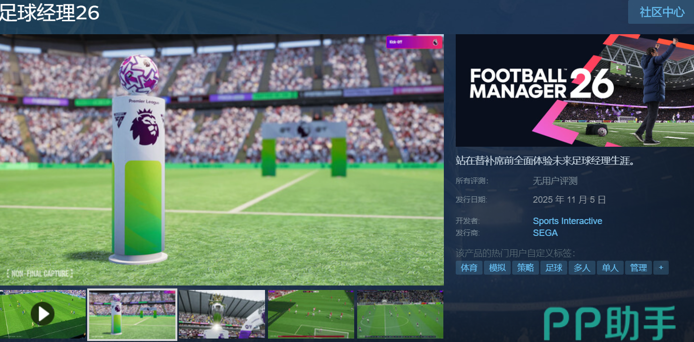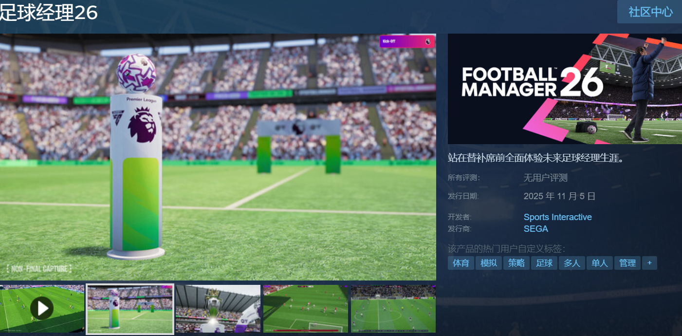 足球经理2026在Steam平台上的正式名称就是足球经理2026,其英文名称是Football Manager 2026,直接搜索中文名称即可找到这款游戏了,计划于2025年11月5日正式发售,将全面登陆PC、PS5以及Xbox等多平台。