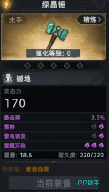 绿晶锤拥有雷电附魔能力,每次重击都有几率释放震荡波,造成额外打击效果。其近战爆发力出色,但对使用者的操作节奏和词条搭配有一定要求,建议在装备成型后再充分发挥其潜力。