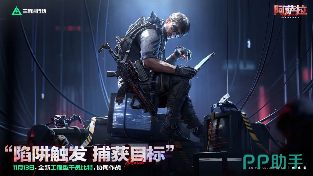 全新防守型干员“比特”正式加入战场,定位为工程支援角色。其两个核心技能均围绕“蜘蛛”装置展开,可部署自动巡逻单位,实现敌人禁锢、路径追踪,并附加腐蚀状态效果。另一项技能“智能烟雾”则具备敌方标记功能,为队伍提供精准情报支持。