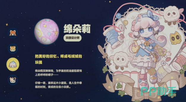 棉朵莉是一位温柔可爱的小羊少女,热爱手工制作,尤其喜欢用布艺还原生活中的美好瞬间。吃到美味的奶油蛋糕后,她会缝制一个精致的蛋糕玩偶;看到夕阳下的花朵,也会创作出捧花的小兔子手办。玩家若希望获得独特又富有纪念意义的装饰品,找她定制无疑是最佳选择。