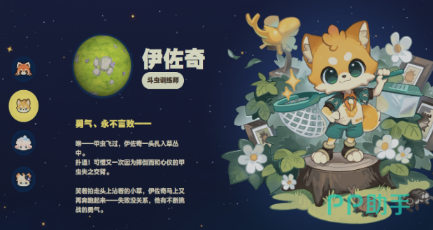 伊佐奇是一位精力充沛的斗虫训练师,原型为浅黄色狐狸,常穿着绿色运动服,手持捕虫网四处奔走。他行动迅速,充满斗志,从不轻易言败。这样的特质使他成为野外探险的最佳人选。无论是搜寻罕见昆虫,还是深入未知林区,他总能带来意想不到的收获,让探索过程更加生动有趣。