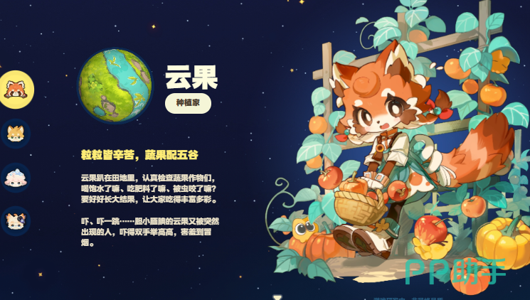 云果是田间最熟悉的身影,她身穿浅褐色的劳作服,衣角常带着泥土与草叶的痕迹。一条橙色的狐尾自然垂落,在走过作物时轻轻拂过叶片,仿佛在检查植物的生长状态。每天清晨天未亮,她便提着藤编小篮开始巡田,细致查看每株植物的健康情况。一旦发现虫害迹象,便会从篮中取出亲手调配的天然驱虫液,动作熟练而温和,展现出对土地深厚的关怀。