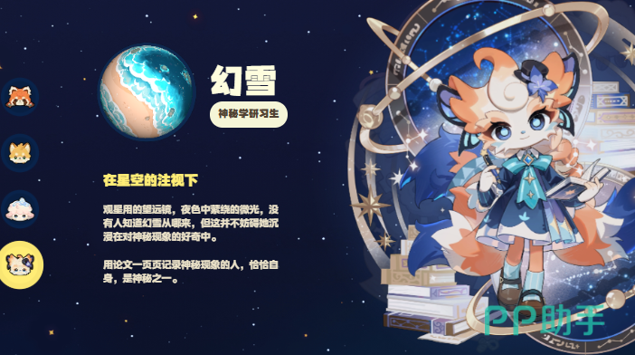 幻雪总在夜幕降临后现身于高地之上,身披深色长裙,裙面上点缀着银色星辰图案,随风轻扬宛如流动的夜空。她手持观星望远镜,凝视遥远星河,九条洁白的狐尾在身后舒展,尾尖偶尔闪现如星光般的微芒。她言语不多,多数时间沉浸于星空解读之中。若有人夜晚迷失方向,她会低声指引路径,声音清冷却令人安定,随后便再次将视线投向浩瀚宇宙,仿佛在接收来自星辰的低语。
